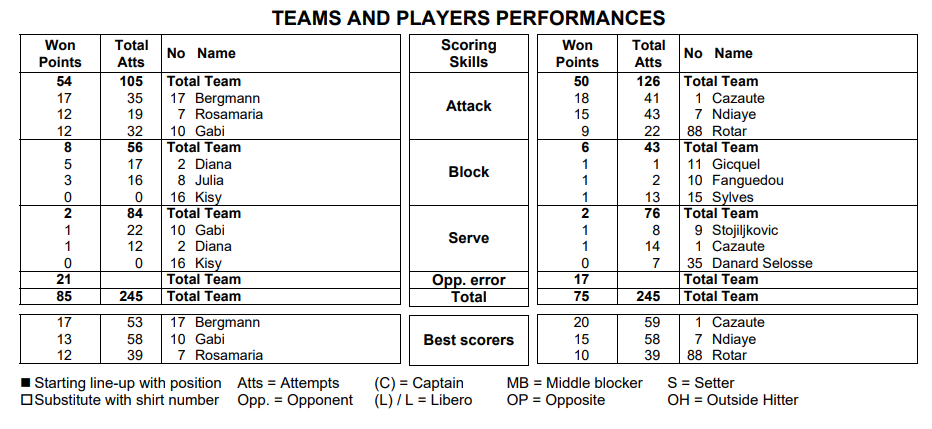 Bergmann 8, Rosamaria 7, Diana 5, Gabi 4, Julia 2 sayıyla oynarken, Fransa'da Cazaute 7, Ndiaye 6, Rotar 5 sayı katkısı yaptılar ancak seti çevirmeye yeterli olamadılar.