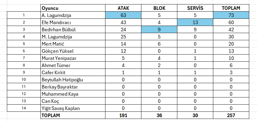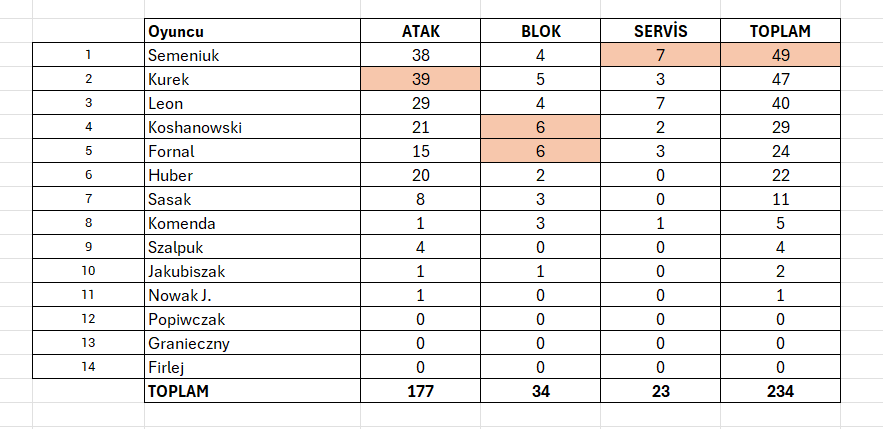 Rakip hataları dışında oyuncular üzerinden alınan sayılar dikkate alındığında üstünlüğü elinde bulunduran Türkiye, bireysel istatistiklerde de Polonya'ya karşı üstün durumda.