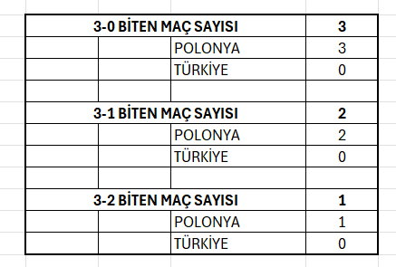 Her iki takımda geride kalan 4 maçta 14 set oynadılar. Türkiye bu yılkı organizasyonda 191 hücum, 36 blok, 30 servis sayısı ile toplam 257 sayı kazanırken, Polonya 177 hücum, 34 blok, 23 servis sayısı ile toplam 234 sayı kaydetti.