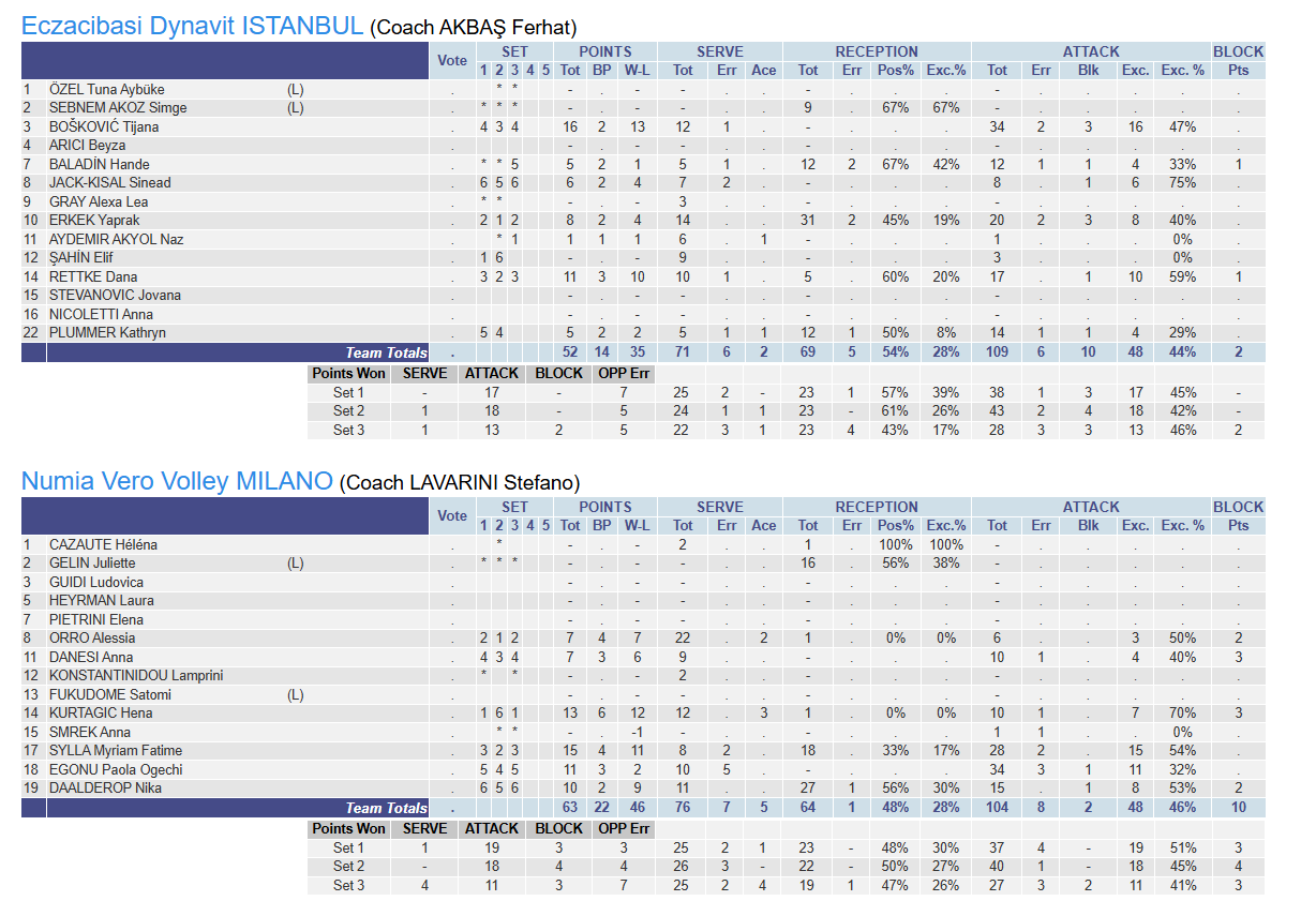 Eczacıbaşı Dynavit: 0 – Vero Volley Milano: 3 Salon: TVF Burhan Felek Vestel Voleybol Salonu Hakemler: Wim CAMBRÉ (Belçika), Benedikt GEUKES (Almanya) Setler: 24-26, 24-26, 21-25 Süreler: 30', 28', 25' Maçın istatistikleri için tıklayınız.Eczacıbaşı Dynavit: Elif, Yaprak, Rettke, Boskovic, Boden, Jack-Kısal, Simge (L), Gray, Naz.