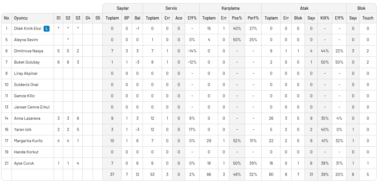 Karşılaşmanın başından sonuna kadar momentumu elinde tutan ve etkili bir oyun ortaya koyan turuncu beyazlılar, savunma ve hücum organizasyonuyla maçı 25-14, 25-20 ve 25-18‘lik set skorlarıyla 3-0 kazanarak AXA Sigorta Kupa Voley’de yarı finalist oldu. Maç boyunca aldığı 18 sayıyla Tijana Boskovic karşılaşmanın en skorer ismi oldu. Kaydettiği 13 sayıyla Hande Baladın galibiyetin kazanılmasında önemli rol oynadı. Eczacıbaşı Dynavit’li oyuncular 7 blok ve 3 servis sayısı elde etti.