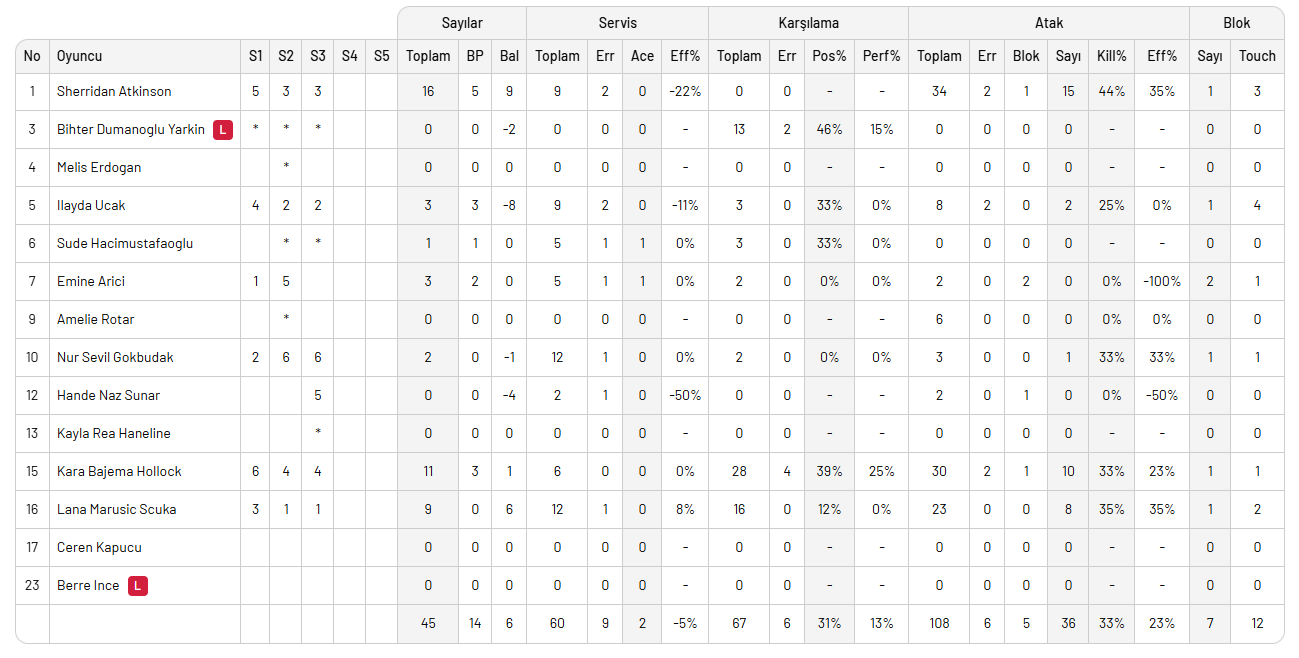 Set süreleri: 30', 24', 29'Göztepe: Emine, Nursevil, Marusic, İlayda, Atkinson, Bajema, Bihter (L), Berre (L), Melis, Sude, Rotar,