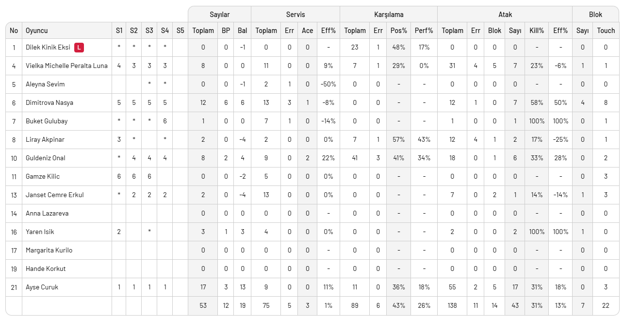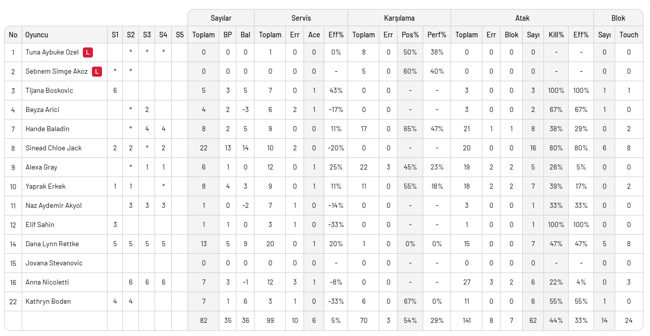Eczacıbaşı Dynavit: Yaprak, Jack-Kısal, Elif, Boden, Rettke, Boskovic, Simge (L), Naz, Nicoletti, Gray, Hande, Beyza, Nicoletti, Aybüke (L).