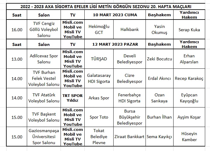 AXA Sigorta Efeler Ligi Metin Görgün Sezonu 20. hafta maçları 10-12 Mart tarihlerinde oynanacak. MHGK Başkanı Aziz Yener, ligin yirminci hafta maçlarında görev yapacak hakemleri yaptığı yazılı açıklamayla duyurdu. İşte AXA Sigorta Efeler Ligi yirminci haftasında oynanacak maçlarda görev yapacak hakemler: