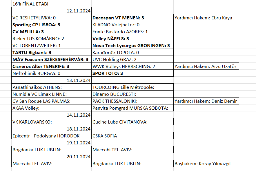 Ülkemizi Spor Toto Spor Kulübü'nün temsil ettiği 2025 CEV Challenge Cup’ta 16'lı final etabı ilk maçları devam ediyor. Bu kupadaki tek temsilcimiz Spor Toto, konuk olduğu takımını 3-0 yenerek avantajlı skoru elde etti. Bu turda Uluslararası Voleybol Hakemlerimiz ebru Kaya, Arzu Uzatöz, Deniz Demir ve Koray Yılmazgil de yönetecekleri maçlarla ülkemizi temsil edecekler.