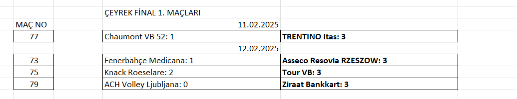 Ülkemizi Fenerbahçe Medicana ve Ziraat Bankkart takımlarının temsil ettiği 2025 CEV Cup’ta Çeyrek Final ilk maçları oynandı. Bu turda rövanş maçları 25-26 Şubat tarihlerinde oynanacak. 2025 Erkekler CEV Cup’ta Çeyrek Final ilk maçlarında alınan sonuçlar ve rövanş maçlarının programı şöyle: