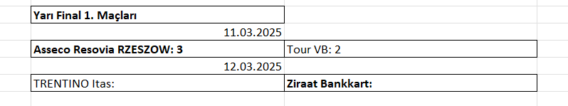 Ülkemizi Ziraat Bankkart’ın temsil ettiği Erkekler 2025 CEV Cup’ta yarı final mücadelesi başladı. Yarı final maçlarının ilkinde Polonya'da oynanan maçta Asseco Resovia RZESZOW,2 kez geriye düştüğü maçta Fransız rakibi Tour VB'yi 3-2 yendi. 12 Mart Çarşamba 22.30 Trentino Itas (ITA)-Ziraat Bankkart – CEV Cup Yarı Final 1.Maçı – TRT Spor Yıldız