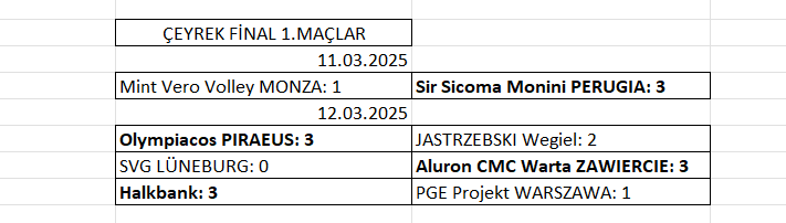 Ülkemizi Halkbank’ın temsil ettiği 2025 Erkekler CEV Şampiyonlar Ligi çeyrek final ilk maçları tamamlandı. Çeyrek final ilk maçlarında alınan sonuçlar ve rövanş maçlarının programı şöyle: