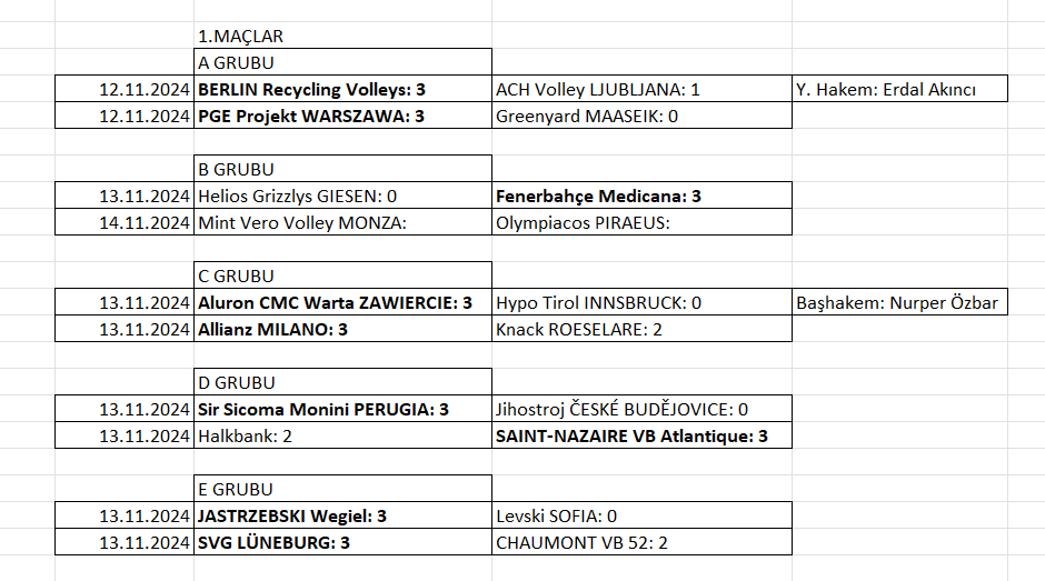 Erkeklerde Şampiyonlar Ligi gruplarında oynanan maçlar ve kalan maçalara ait program şöyle: