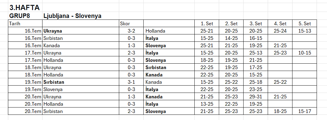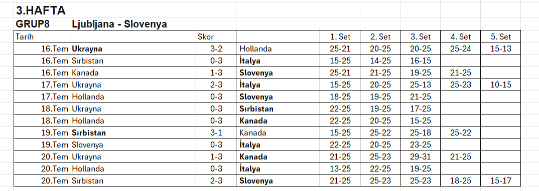 Erkeklerde 2025 FIVB Voleybol Milletler Ligi’nde 3. Etap maçları 20 Temmuz Pazar günü Polonya, Slovenya ve Japonya’da oynanacak maçlarla sona erdi. 20 Temmuz Pazar günü oynanan karşılaşmalarla VNL’in grup aşaması tamamlandı. Hollanda VNL’e veda etti. İkinci kez VNL'de yer alan A Erkek Milli Takımımız, 12 maçta 3 galibiyet ve 10 puanla 16. sırada yer aldı. 8-18. Sırada Yer Alan Takımlar:
