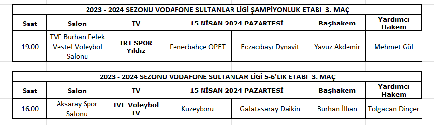 Vodafone Sultanlar Ligi'nde final etabı ve 5-6.'lık serisi üçüncü maçlarında görev yapacak hakemler belli oldu. MHGK Başkanı Aziz Yener, haftanın maçlarını yönetecek hakemleri açıkladı.