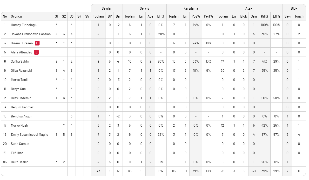 Beşiktaş: Dilay, Saliha, Beliz, Brakocevic, Rozanski, Maglio, Gizem (L), Derya, Merve, Hümay, Merve