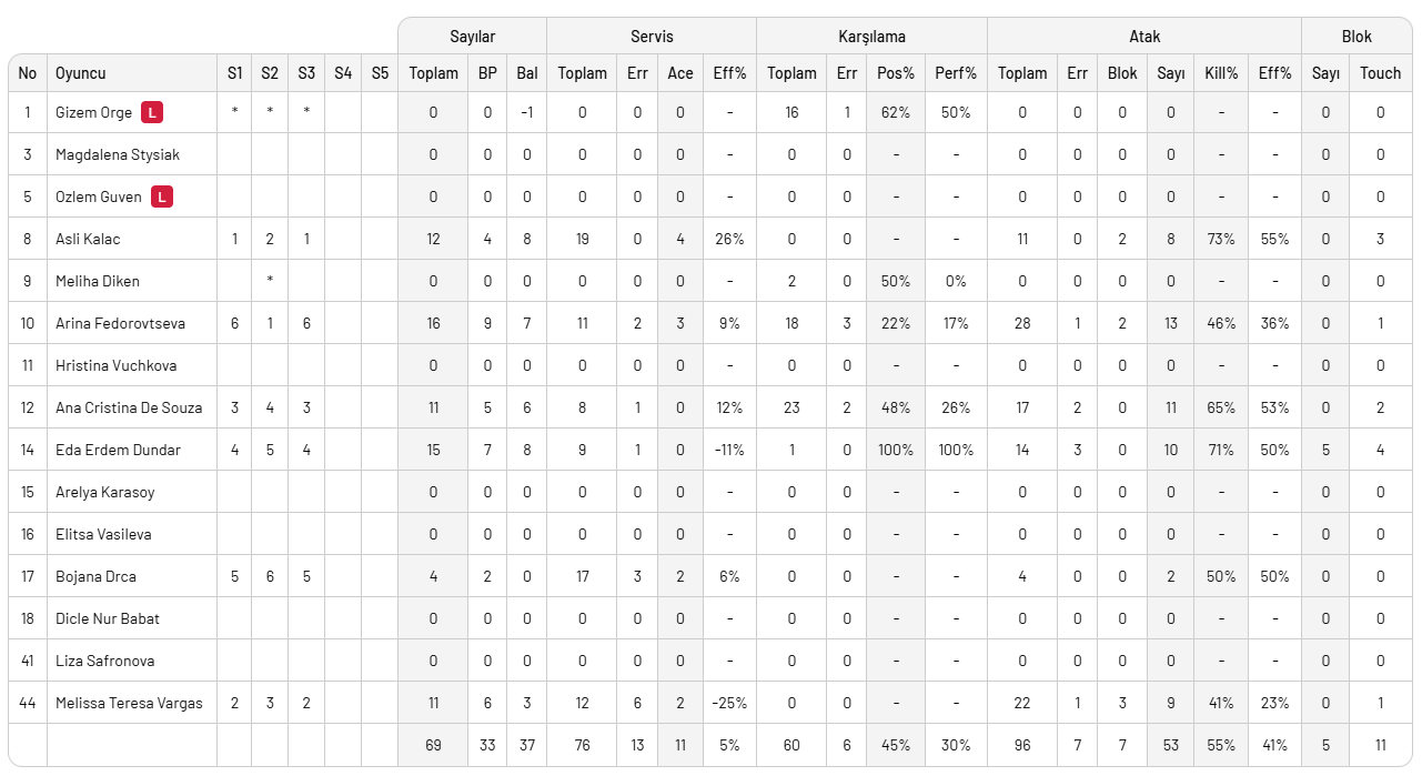Fenerbahçe Medicana: Aslı, Vargas, Ana Cristina, Eda, Drca, Arina, Gizem (L), Meliha, Liza,