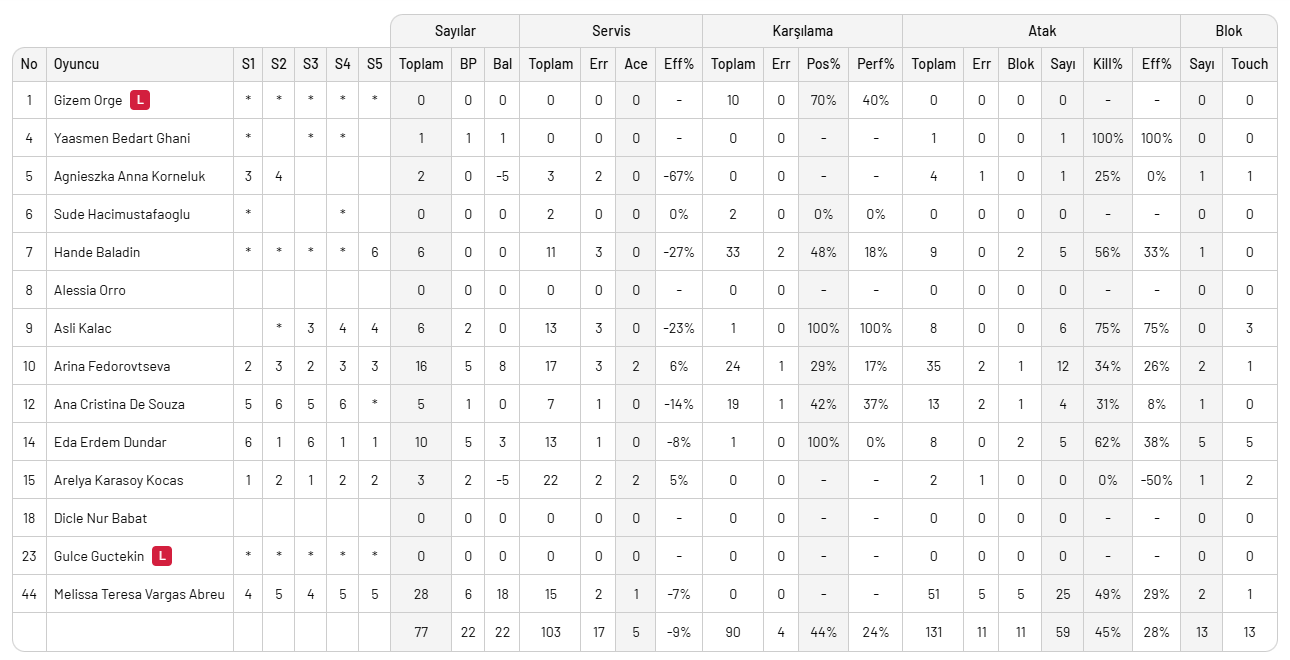 Karşılaşmada 13 blok, 59 hücum, 5 servis sayısı ile 27 direkt rakip hatasından bulduğu sayılarla maçı kazanan Fenerbahçe’de Vargas 28, Arina 16, Eda 10 sayıyla çift haneli katkı yaptılar.