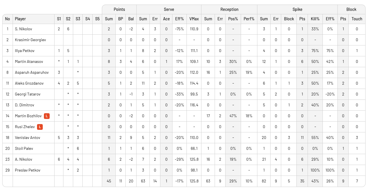 Ev sahibi ekipte Alex Nikolov 9 sayıyla öne çıkarken, Viktor Antov ve Martin Atanasov 8’er sayıyla destek verdi. Ancak takım genelindeki servis ve hücum hataları, Bulgaristan’ın oyundan kopmasına neden oldu.