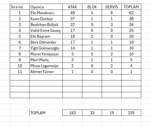 Efe Mandıracı 49 hücum, 5 blok, 8 servis toplam 62 sayı ile ilk etapta en fazla sayı kazandıran oyuncumuz oldu. Efe Mandıracı VNL genel sıralamasında da 3.sırada bulunuyor.