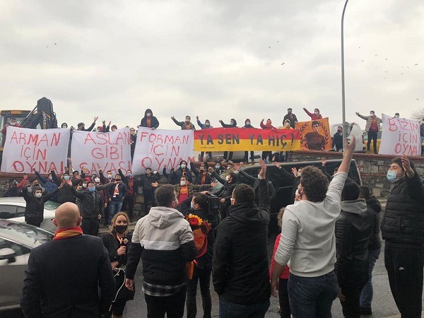 Pandemi süreci sebebiyle seyircisiz oynanan maçlarda tribünlerdeki yerini alamayan Galatasaray Taraftar Grubu ultrAslan, İtalya'nın Saugella Monza takımı ile oynayacağı Final rövanş maçı öncesi maçın oynanacağı TVF Burhan Felek Vestel Voleybol Salonu önünde takımlarına büyük moral verdiler.