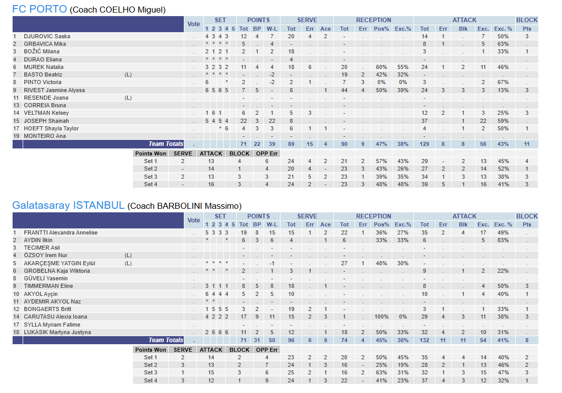 Karşılaşmada 8 blok, 54 hücum ve 9 servis sayıyla maçı kazanan Galatasaray'da Frantti 19 sayı katkısı şke takımımızın en skorer ismi oldu. Porto'dan Joseph 22 sayıyla maçın en skorer oyuncusu oldu.