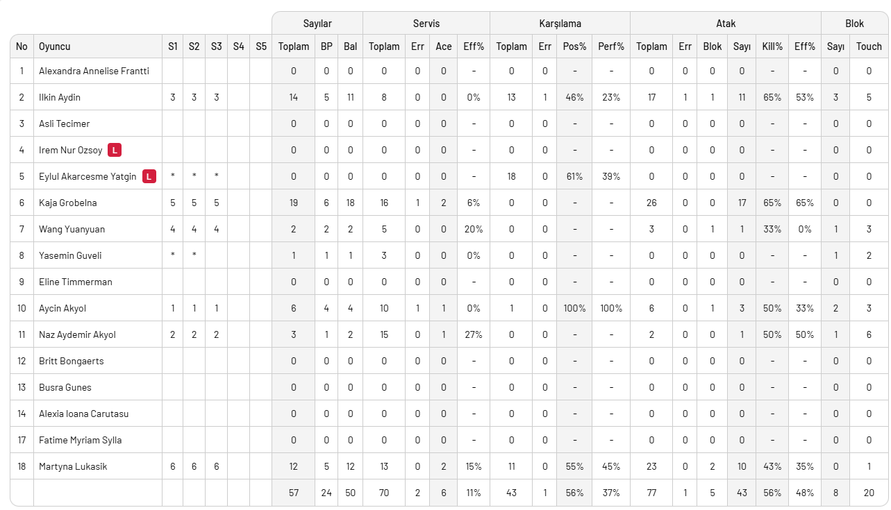 3-0'lık galibiyetle 3 puan kazanan Galatasaray, karşılaşmada 8 blok, 43 hücum ve 6 servis sayı ile rakibinin 18 direkt hatasından aldığı sayıyla galip geldi. Sarı kırmızılılarda Gorblena 19, İlkin 14 sayıyla çift haneli sayılara ulaştı.