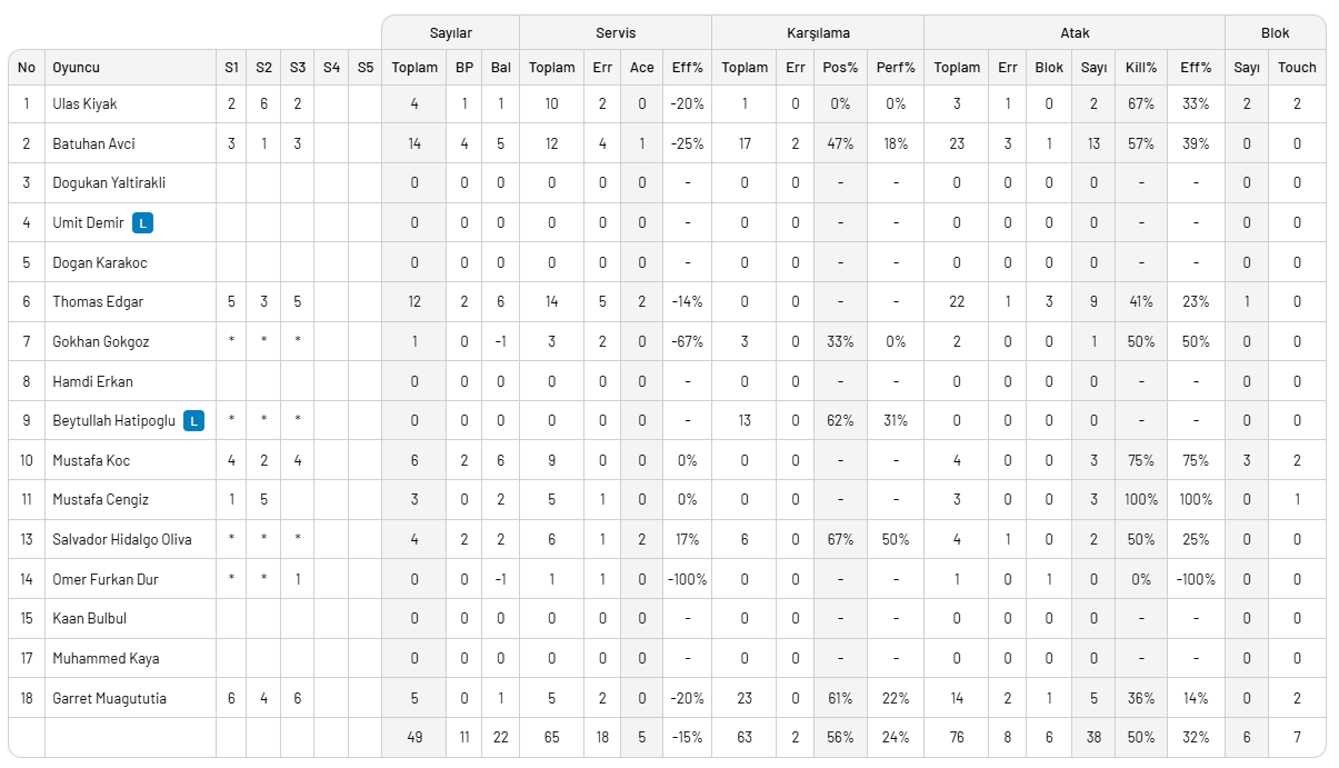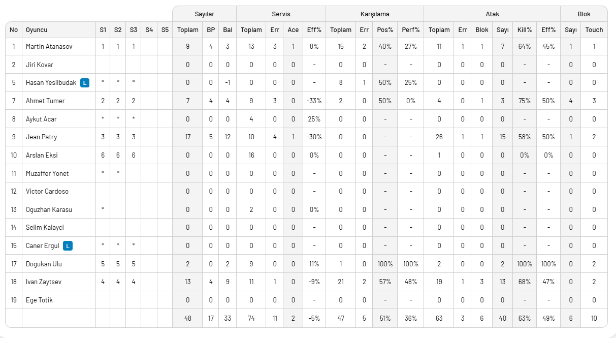 Galatasaray HDI Sigorta : Atanasov, Ahmet Tümer, Patry, Zaytsev, Doğukan Ulu, Arslan Ekşi (Caner Ergül, Hasan Yeşilbudak, Oğuzhan Karasu, Muzaffer Yönet, Aykut Acar)