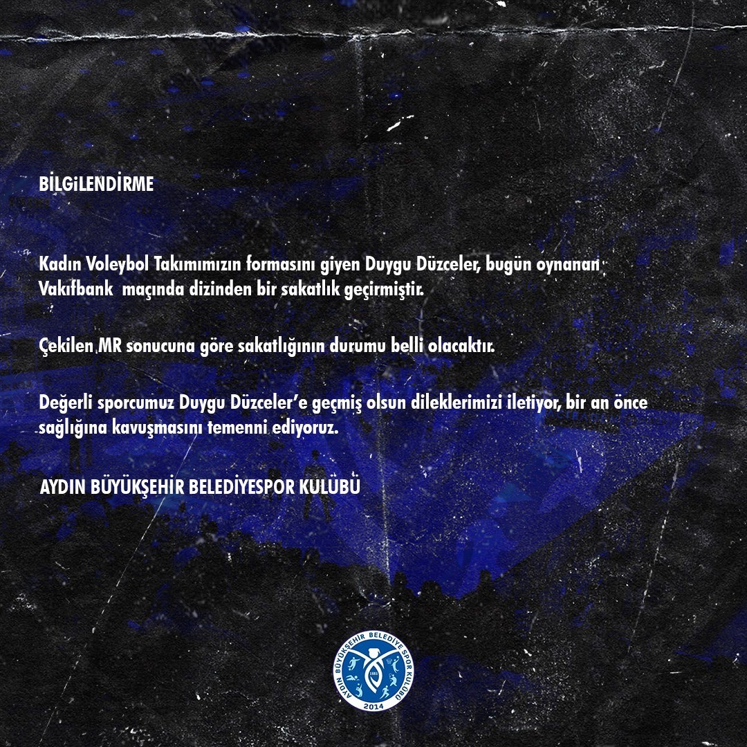 Misli.com Sultanlar Ligi'nde VakıfBank’a 3-0 boyun eğerek ligdeki ilk mağlubiyetini alan Aydın’ın Sultanları, Duygu’nun maçta sakatlanması ile çifte üzüntü yaşadı. Mavi beyazlı ekipte üçüncü sezonunu geçiren tecrübeli oyuncu Duygu, VakıfBank maçında dizinden sakatlanarak acılar içerisinde salonu terk etti.