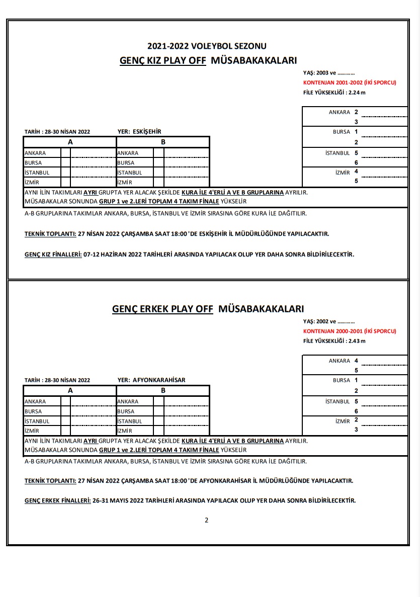 Gençler Kategorisi (Kız-Erkek) play off müsabakalarında yerler belli oldu. Gençler Kategorisi (Kız-Erkek) play off talimatına ulaşmak için tıklayınız.