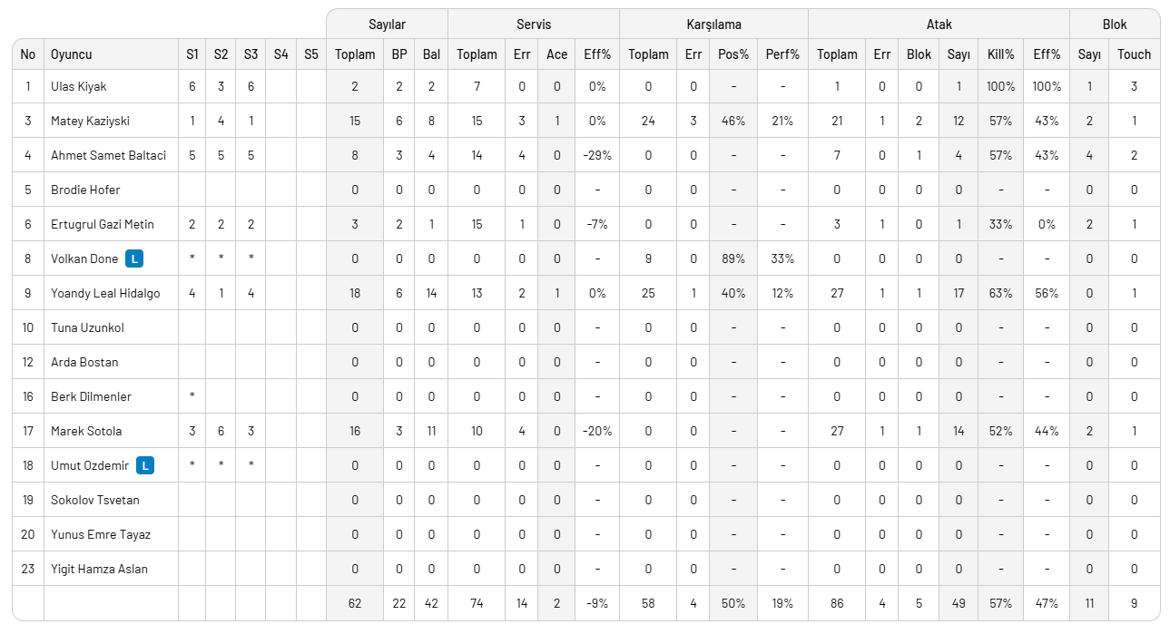 Set süreleri: 28', 27', 26'Halkbank: Matey Kaziyski, Ertuğrul Gazi Metin, Marek Sotola, Yoandy Leal Hidalgo, Ahmet Samet Baltacı, Ulaş Kıyak, Volkan Döne (L), Umut Özdemir (L), Yiğit Hamza Aslan, Arda Bostan, Tuna Uzunkol, Brodie Hofer, Yunus Emre Tayaz, Tsvetan Sokolov, Berk Dilmenler