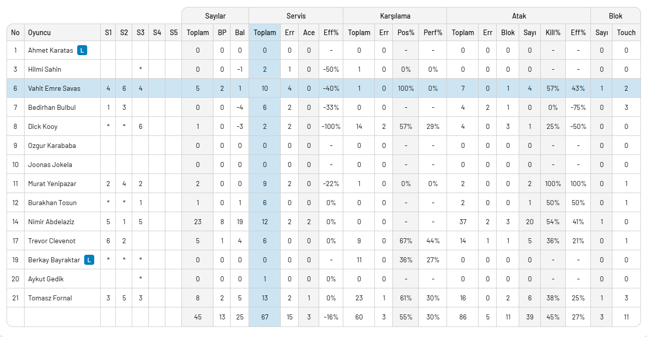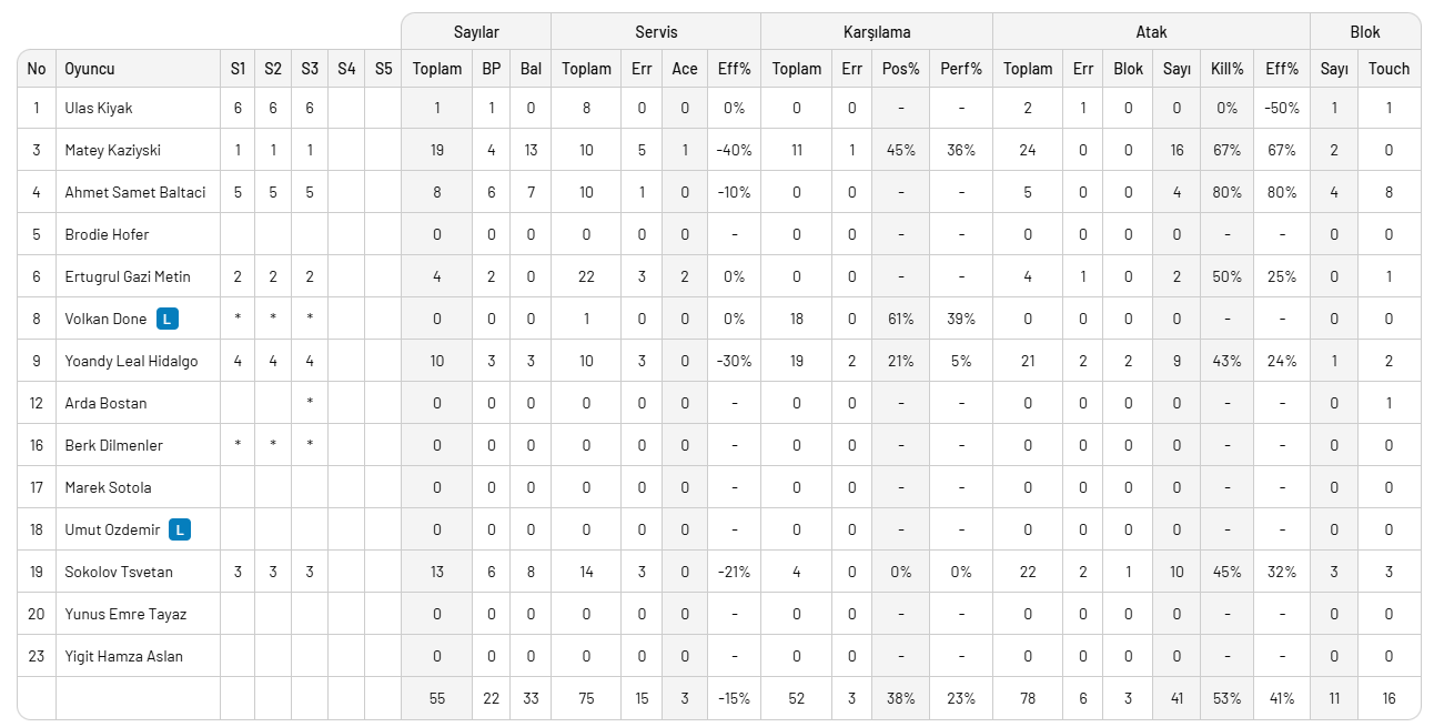 Ziraat Bankkart: Bedirhan, Murat, Fornal, Vahit Emre, Nimir, Clevenot, Berkay (L), Burakhan, Kooy,Halkbank: Kaziyski, Ertuğrul Gazi, Sokolov, Leal Hidalgo, Ahmet Samet, Ulaş, Volkan (L), Berk, Arda,