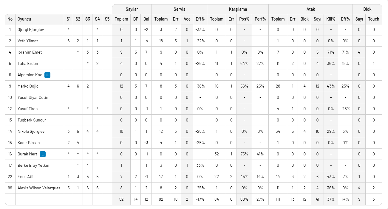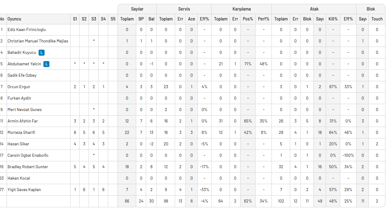 Türşad: 1 - İstanbul Gençlik SK: 3 Hakemler: Seçkin Yener, Furkan Salduz Setler 17-25, 22-25, 26-24, 16-25 TÜRŞAD: İbrahim Emet, Taha Erden, Alparslan Koç, Marco Bojic, Kadir Bircan, Burak Mert, Berkay Eray Yetkin, Enes Atlı, Vefa Yılmaz, Alexis Wilson Velazguez, Gjorgi Gijorgiev, Yusuf Eken, Tuğberk Sungur, Nikola Gijorgjev İstanbul Gençlik SK: Ediz Kaan Fırıncıoğlu, Cristian Manuel, Bahadır Kuyucu, Abdulsamet Yalçın, Orçun Ergün, Mert Nevzat Güneş, Armin Afshin Far, Morteza Shafiri, Hasan Sıkar, Cansın Ogbai, Bradley Robert Gunter, Hakan Kocal, Yiğit Savaş Kaplanİstanbul Gençlik SK, Efeler Ligi'nde TÜRŞAD karşısında önemli bir galibiyet elde etti. Maça hızlı başlayan İstanbul Gençlik SK, ilk seti alarak avantaj sağladı. TÜRŞAD ise ikinci sette toparlanarak eşitliği sağladı ancak bu durum uzun sürmedi. Üst üste kazandığı setlerle maçı kontrol altına alan İstanbul ekibi, son seti de kazanarak maçtaki üstünlüğünü pekiştirdi. Bu galibiyetle birlikte İstanbul Gençlik SK, sezonun ilerleyen dönemlerinde daha iddialı bir konuma gelmeyi hedefliyor. Takımın performansı ve oyuncularının sergilediği oyun dikkat çekti.