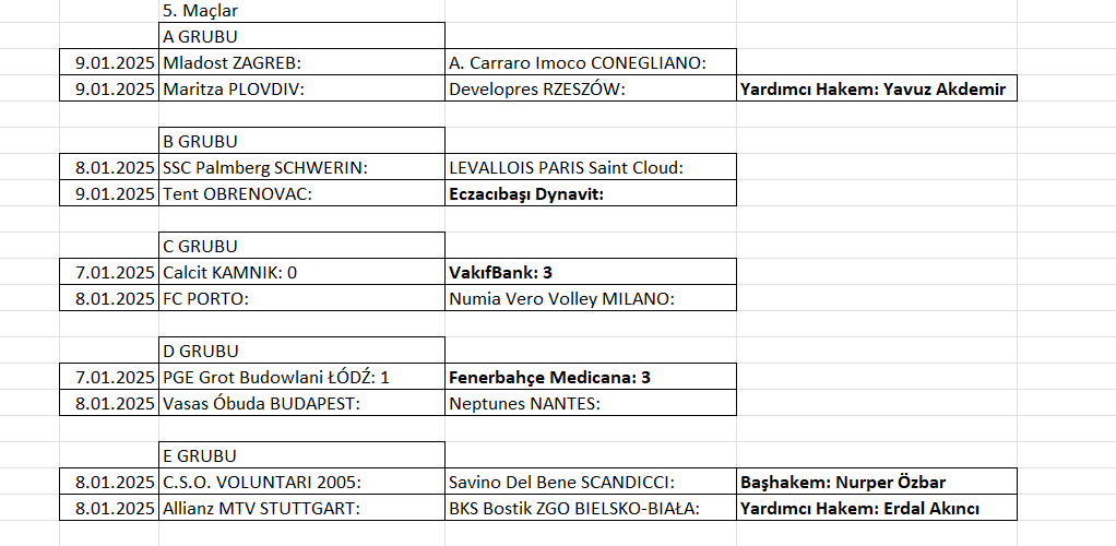 Kadınlarda 2025 CEV Şampiyonlar Ligi gruplarında 5. maçlar başladı. Temsilcimiz Fenerbahçe Medicana gruplarda 5. maçını da kazandı ve lider olarak çeyrek finale çıkmayı garantiledi. VakıfBank ise oynadığı 5 grup maçında da set vermeden kazandı. Sarı siyahlılar liderliğini sürdürürken gruptan çıkmayı garantiledi. VakıfBank'ın gruptan lider yada ikinci olarak çıkması 22 Ocak Çarşamba günü İtalya'da oynanacak Numia Vero Volley MILANO karşılaşmasıyla belli olacak.