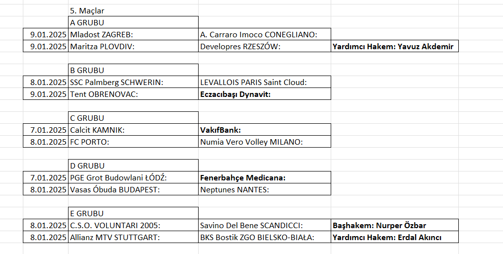 Kadınlarda 2025 CEV Şampiyonlar Ligi gruplarında 5. maçlar başlıyor.