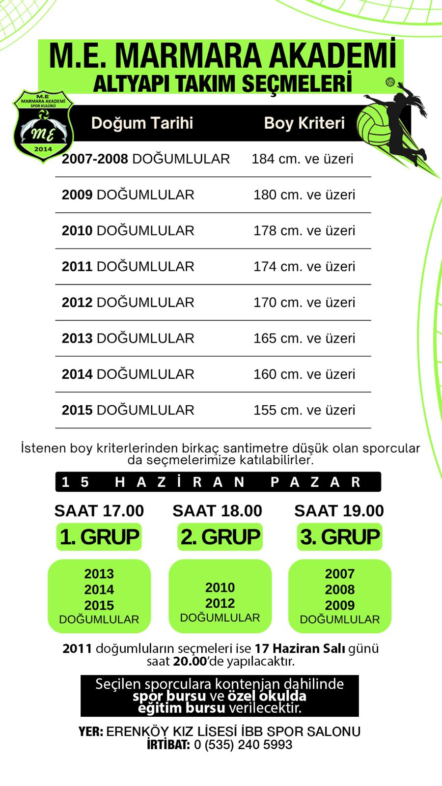 İstanbul Anadolu Yakasındaki başarılı alt yapı spor kulüplerinde olan Mehmet Erdem Marmara Akademi Spor Kulübü seçmeleri 15 Haziran Pazar günü başlıyor. 2007 - 2015 Yılları arasında doğumlu voleybolcu adaylarına yönelik seçmeler Erenköy Kız Lisesi İBB Spor Salonu gerçekleştirilecek. Aşağıdaki kriterlere sahip adayların ilgili tarihte belirtilen yerde olmaları yeterlidir. İrtibat için 0 535 240 59 93 numaralı telefonu arayabilirsiniz.