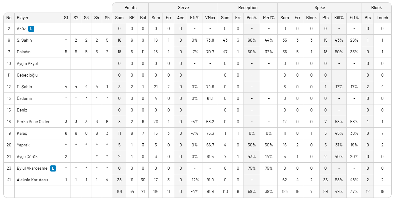 İki sete ilk altıda başlayan Saliha, 10 topta 7 sayı kazandırarak, Aleksiya ise 10 topta 6 sayı, bir servis sayısı ile toplam 7 say kazandırarak takımımızın en skorer oyuncumuz oldu. Seti 3 blok ile tamamlayan Milli Takımımız sadece 1 manşet hatası yaptı.