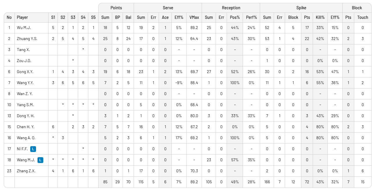 Çin: Gong X.Y., Zhuang, Wang Y.Y., Zhang, Wu, Chen, Wang A.O., Wang M.J. (L), Zou J.O, Dong Y.H., Yang S.M.