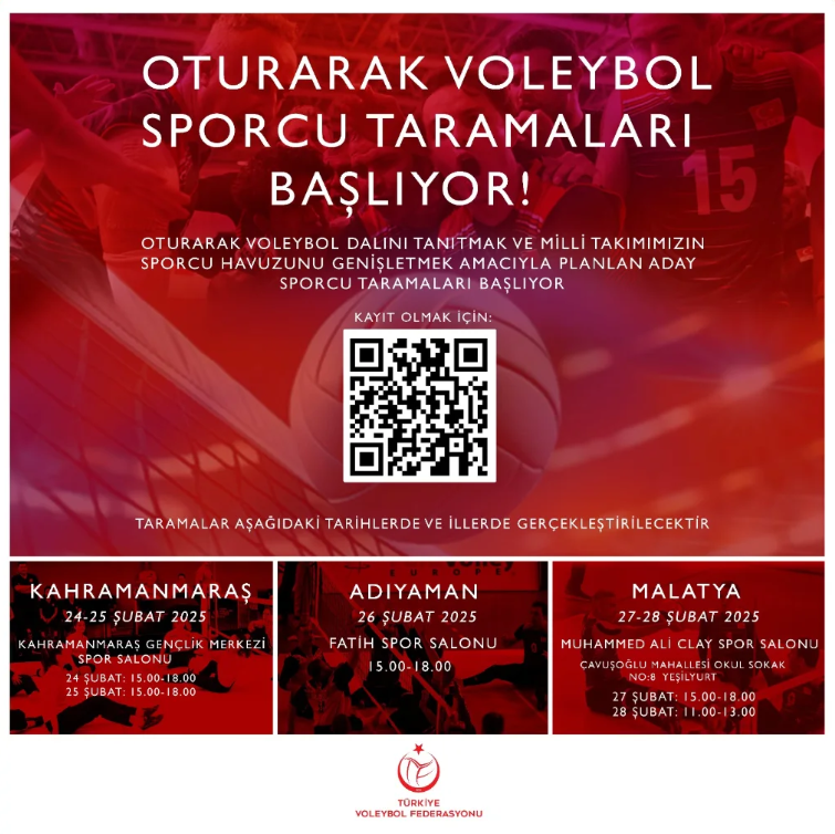 Paralimpik bir spor olan oturarak voleybolu ülkemizde yaygınlaştırmak ve sporcu sayısını artırmak amacıyla hayata geçirilen ve Kahramanmaraş, Adıyaman ve Malatya illerinde gerçekleştirilecek taramaların tarihleri şöyle: