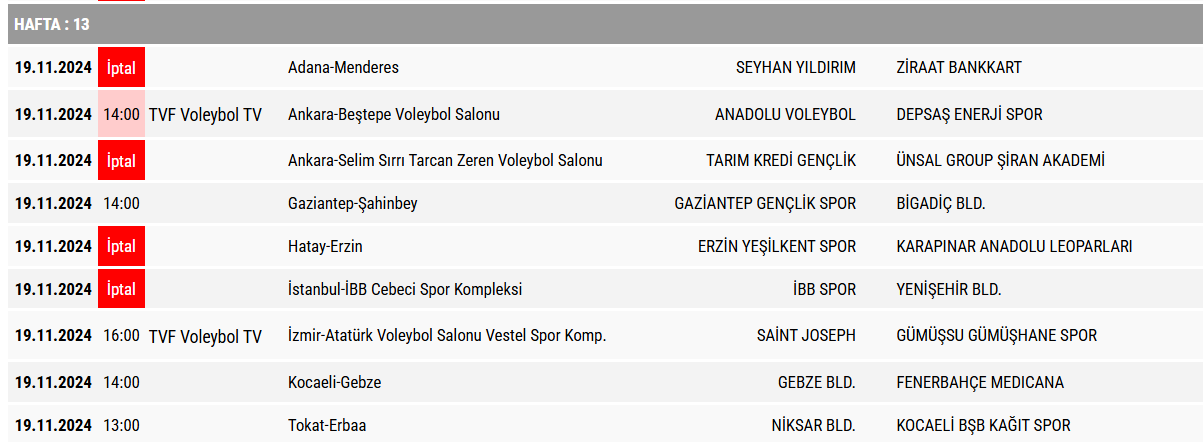 Ligde 13.hafta maçları 19 Kasım Salı günü oynanacak. Haftanın programı şöyle: