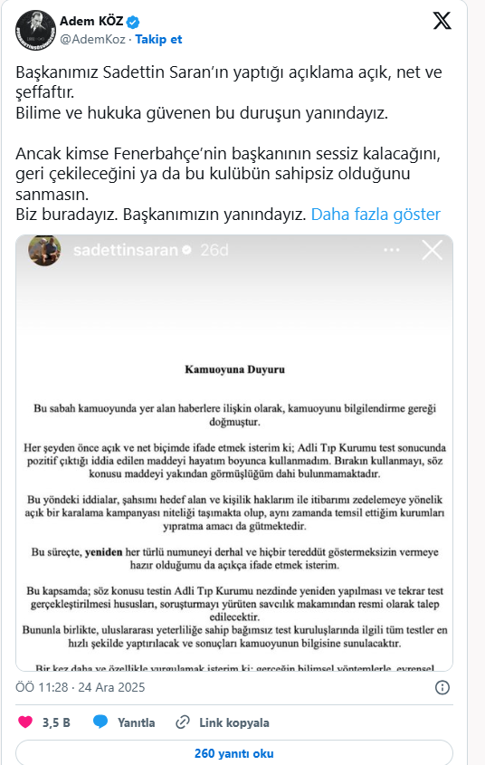 Sadettin Saran, sosyal medya hesabından yaptığı açıklamada, söz konusu maddenin hayatı boyunca kullanmadığını belirtti. Saran, testin Adli Tıp Kurumu nezdinde yeniden yapılması için savcılığa resmi talepte bulunulacağını, ayrıca uluslararası yeterliliğe sahip bağımsız kuruluşlarda da test yaptırılacağını ifade etti.