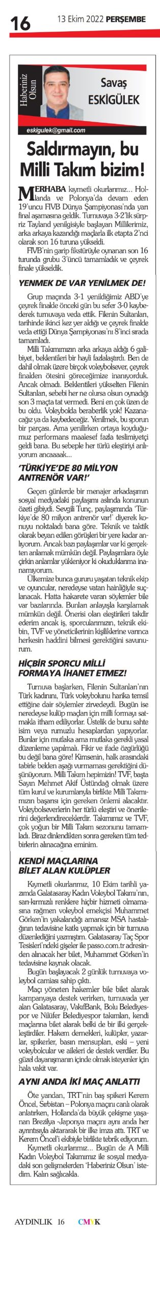Ülkemize bunca gururu yaşatan teknik ekip ve oyuncular, neredeyse vatan hainliğiyle suçlanacak. Hatta hakarete varan söylemler bile var bazılarında. Bunları anlayışla karşılamak mümkün değil. Önerisi olan eleştirileri takdir ederim ancak iş, sporcularımızın, teknik ekibin, TVF ve yöneticilerinin kişiliklerine varınca herkesin haddini bilmesi gerektiğini savunurum.