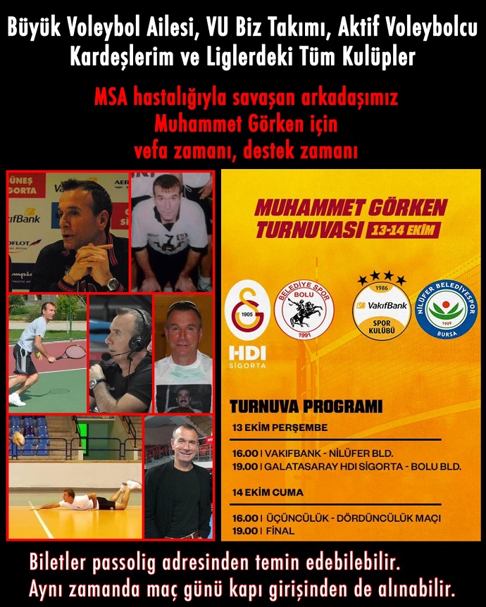 10 Ekim tarihli yazımda Galatasaray kadın voleybol takımının, sarı kırmızılı renklere hiçbir hizmeti olmamasına rağmen voleybol emekçisi Muhammet Görken’in yakalandığı amansız MSA hastalığının tedavisine katkı olmak için bir turnuva düzenlediğini yazmıştım. Galatasaray Taç Spor Tesislerindeki gişeler ile passo.com.tr adresinden alınacak her bilet, Muhammet Görken’in tedavisine kaynak olacak.