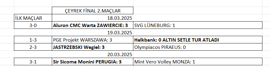 Oynanan maçların ardından 16-18 Mayıs 2025 tarihlerinde Polonya’nın Łódź şehrinde düzenlenecek CEV Şampiyonlar Ligi Dörtlü Finali’ndeki eşleşmeler şöyle: