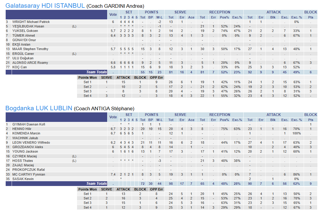 Galatasaray HDI Sigorta: Can Koç, Gökçen Yüksel, Ahmet Tümer, Patrick Wright, Stephen Maar, Roamy Alonso, Caner (L), Hasan (L),Bogdanka LUK LUBLIN: Young, Mc Carthy, Henno, Leon, Grozdanov, Komenda, Hoss (L), Sasak, Gyimah, Sasak,