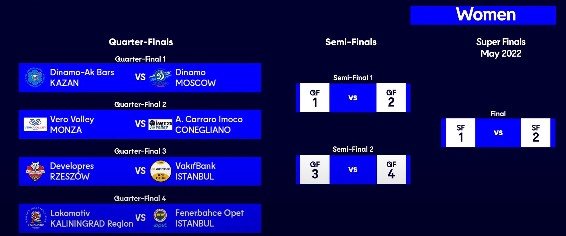 2022 CEV Şampiyonlar Ligi’nde çeyrek final karşılaşmaları, 8-17 Mart 2022 tarihleri arasında çift maç eleme usulüne göre oynanacak.