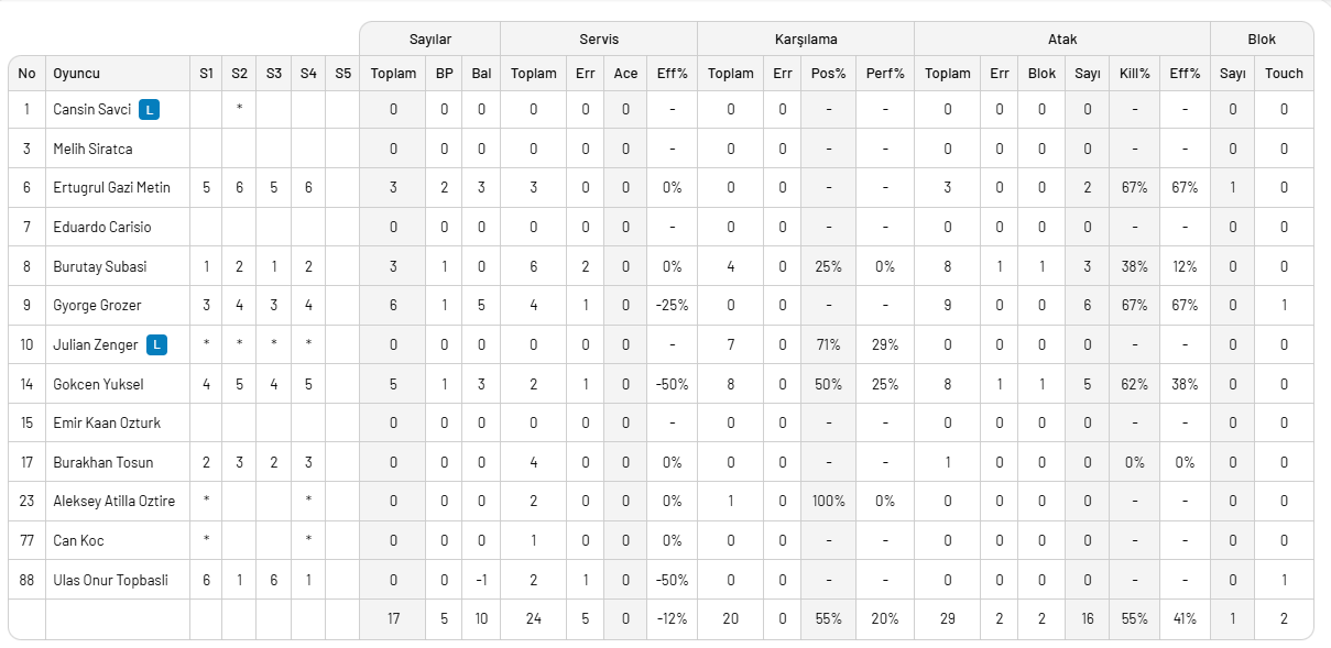 Arkas Spor: Burutay, Burakhan, Grozer, Gökcen, Ertuğrul Gazi, Ulaş, Zenger (L), Atilla, Can,