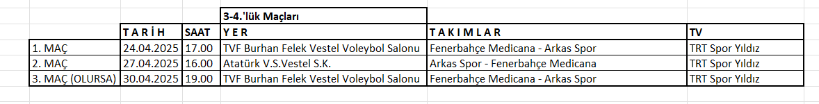 SMS Grup Efeler Ligi'nde Play-Off 3-4 etabının maç programı açıklandı. Üç maç üzerinden oynanacak seride iki (2) galibiyete ulaşan takım sezonu üçüncü olarak tamamlayacak. Canlı yayın ve maç programı şöyle: