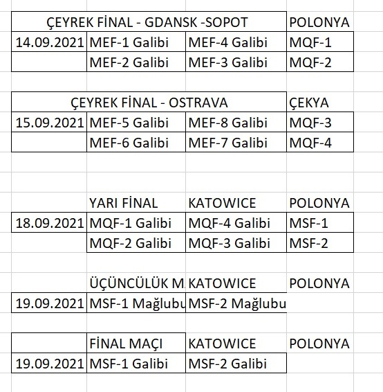 Gdansk - Sopot/Polonya ve Ostrava/Çekya'da oynanacak 2021 CEV EuroVolley son 16 turu maçlarının programı aşağıdadır.