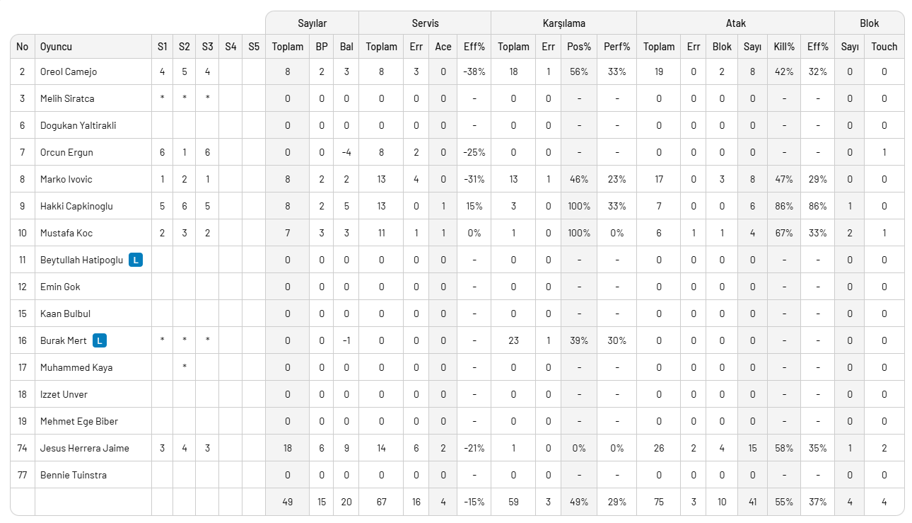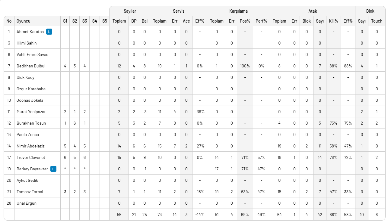 Maç boyunca file üzerinde etkili bir performans sergileyen Başkent ekibi; 10 blok, 42 hücum ve 3 servis sayısı ile galibiyete uzandı. Rakip hatalarından da 20 sayı kazanan Ziraat Bankkart’ta Clevenot 17 sayıyla yıldızlaşırken, Nimir 14 ve Bedirhan 12 sayıyla galibiyete önemli katkı sundu.