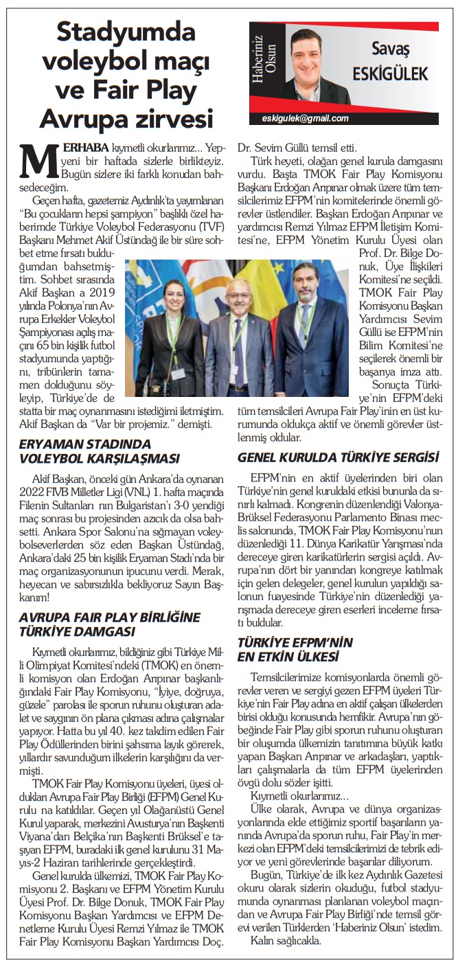 Bugün de sizlere Türkiye’de ilk kez Aydınlık Gazetesi okuru olarak sizlerin okuduğu, futbol stadyumunda oynanması planlanan voleybol maçından ve ülkemizin Avrupa Fair Play Birliği’ndeki temsil görevi verilen Türklerden ‘Haberiniz Olsun’ istedim.
