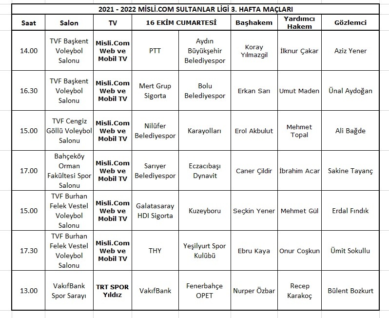 Misli.com Sultanlar Ligi’nde 2021-2022 Sezonunun 3. hafta maçları 16 Ekim Cumartesi günü oynanacak. MHGK Başkanı Aziz Yener, yaptığı yazılı açıklama ile Misli.com Sultanlar Ligi’nin üçüncü haftasında görev yapacak hakem ve gözlemcileri açıkladı. İşte sezonun üçüncü haftasında görev yapacak hakem ve gözlemciler: