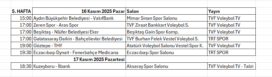 Haftanın önemli karşılaşmalarından Eczacıbaşı Dynavit - Fenerbahçe Medicana karşılaşması ve Galatasaray Daikin - Bahçelievler Belediyespor Beşiktaş maçları TRT Spor'dan canlı olarak yayınlanacak. 17 Kasım Pazartesi günü oynanacak Kuzeyboru - İlbank karşılaşması ise Tabii platformundan yayınlanacak.Sultanlar Ligi'nde 5. haftanın hakemleri belli oldu