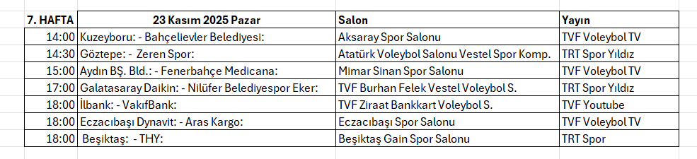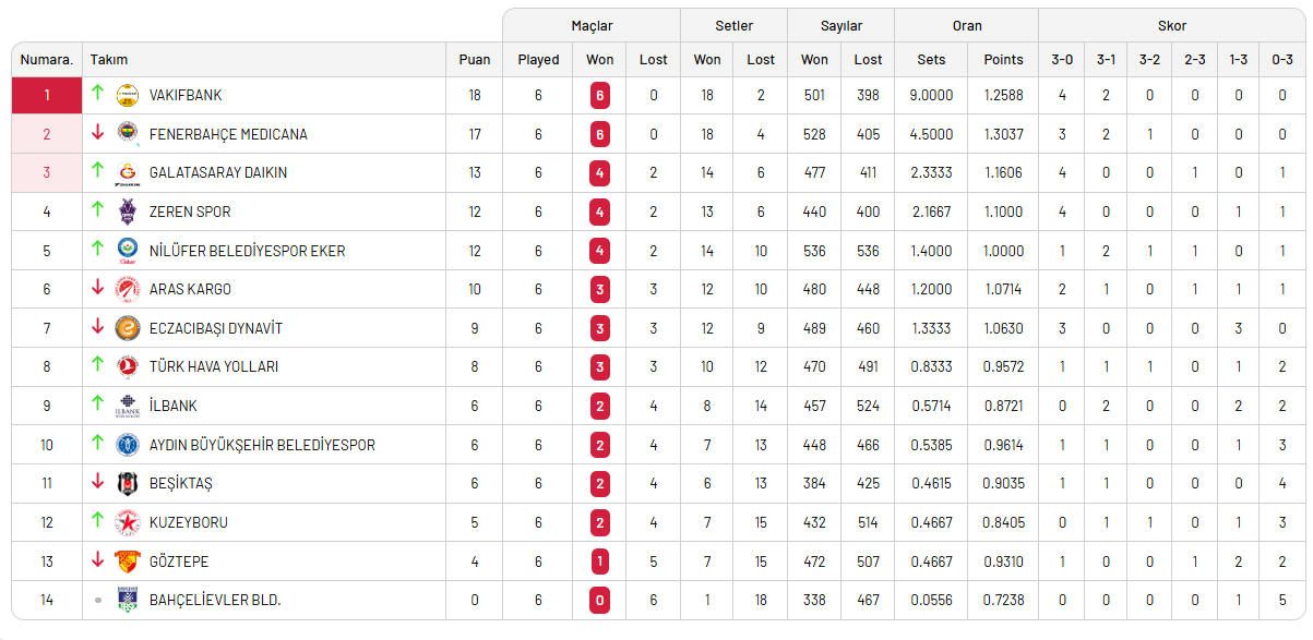 6. HAFTA 20 Kasım 2025 Perşembe Set Skorları 14:00 VakıfBank: 3 - Kuzeyboru: 0 25-19, 25-16, 25-14 15:00 Aras Kargo: - Beşiktaş: 25-19, 25-15, 25-20 15:00 İlbank: - Göztepe: 29-27, 26-24, 21-25, 15:00 THY: 0 - Zeren Spor: 3 15-25, 19-25, 24-26 16:00 Bahçelievler Belediyesi: 0 - Aydın BŞ. Bld.: 3 22-25, 17-25, 13-25 17:00 Nilüfer Belediyespor Eker: 3 - Eczacıbaşı Dynavit: 1 28-30, 25-18, 25-22, 25-22 19:30 Fenerbahçe Medicana: 3 - Galatasaray Daikin:2 27-25, 22-25, 25-23, 25-27, 15-11 Oynanan maçların ardında ligde puan durumu şu şekilde oluştu: